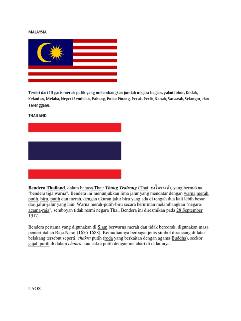 Bahagian yang berwarna biru tua di sebelah kiri. Siapa sahaja boleh mengecam bahawa bendera malaysia, jalur gemilang mempunyai 14 bucu. Bendera merah putih merupakan dua potong kain yang dijahit menjadi satu. Warna merah di bendera kedua negara berbeda. Warna primer ada 3 yaitu biru, merah, dan kuning.